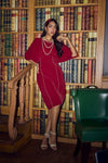 Making power moves in power hues, this dress is made with boat neck, kimono sleeve and fitted paneled bottom.