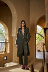 Made to live in your wardrobe, this olive co-ord set includes a flared coat, with a shawl collar, with an inner and flared pants.