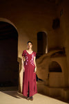 A must have piece to make an impact, this long dress is highlighted with panelled flare detailing, pleated sleeves and beautifully machine embroidered front.